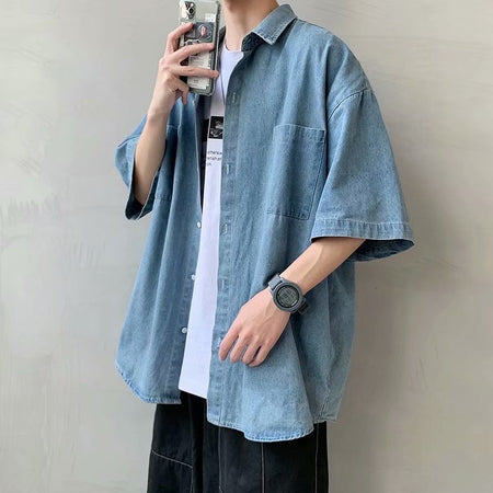 Men’s Denim Short-Sleeve Shirt – Trendy Korean Style Workwear