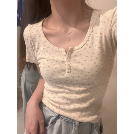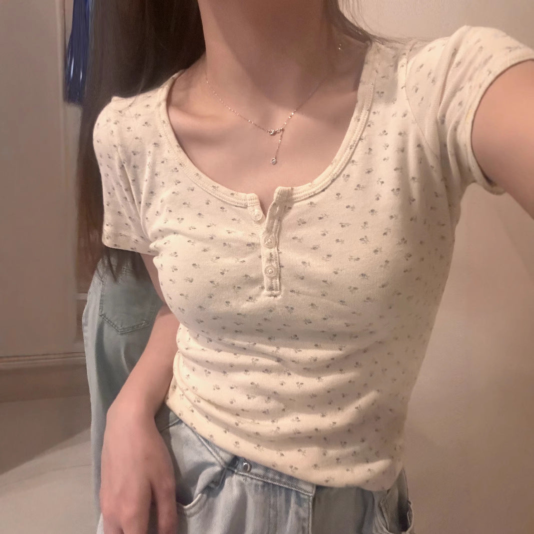 Welcome the warm season with this summer new U-collar floral short sleeve top, designed for women who love a fresh, slim fit look. The delicate floral pattern adds a touch of femininity, while the shoulder-short cut keeps the style light and breezy for sunny days.