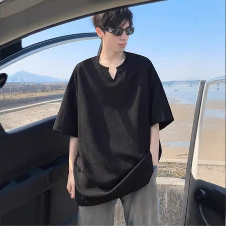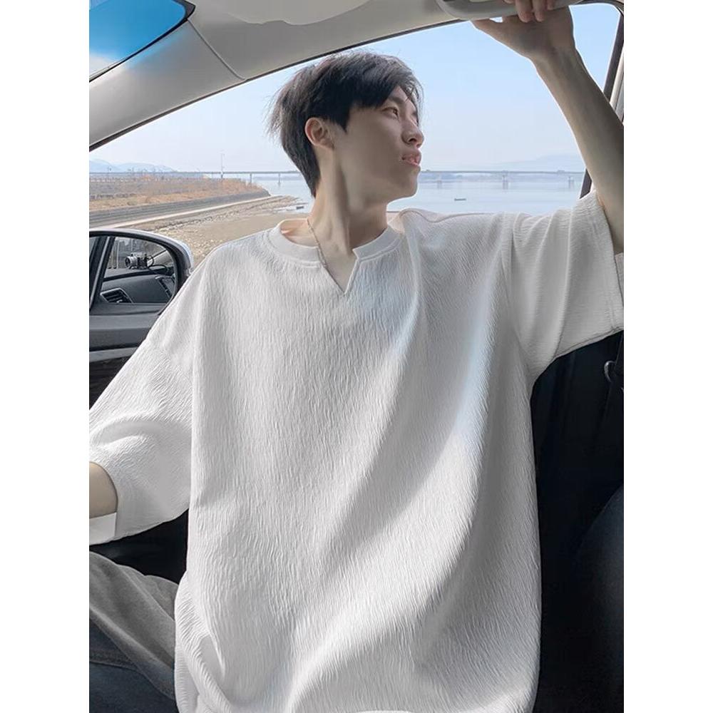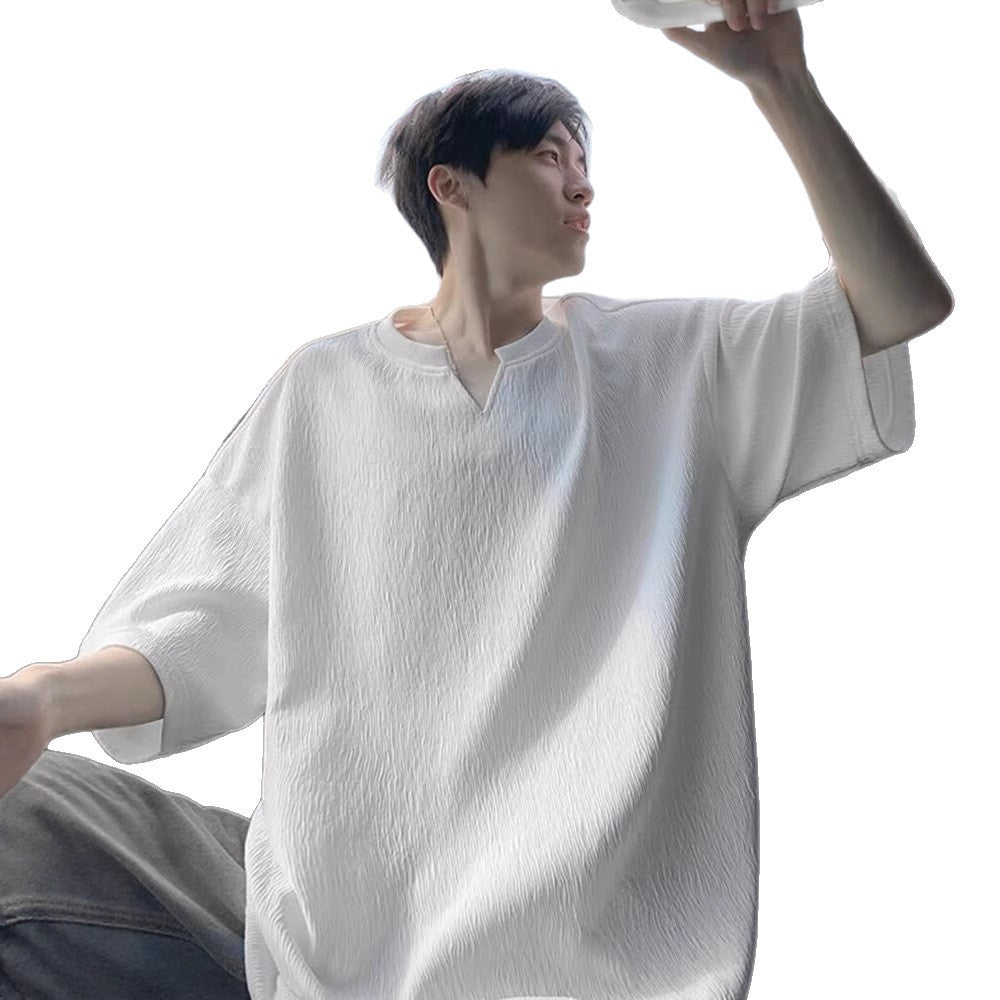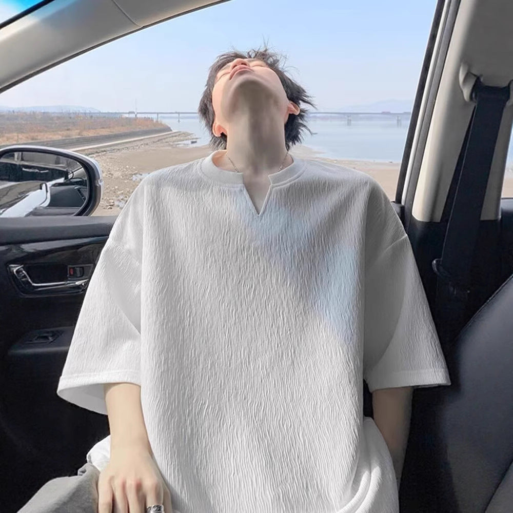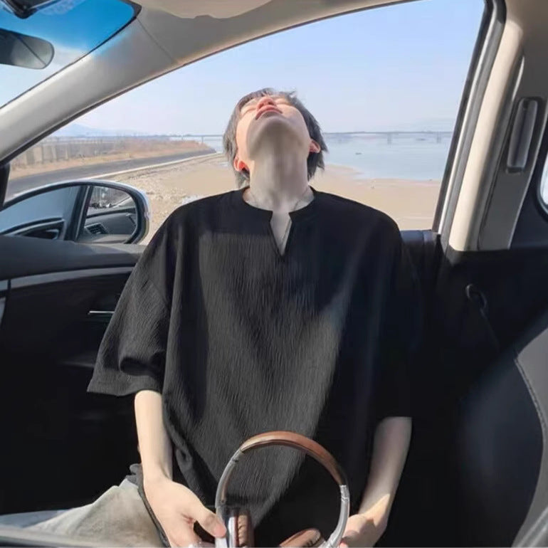 Men’s Textured V-Neck T-Shirt – 2025 Loose Summer Youth Style