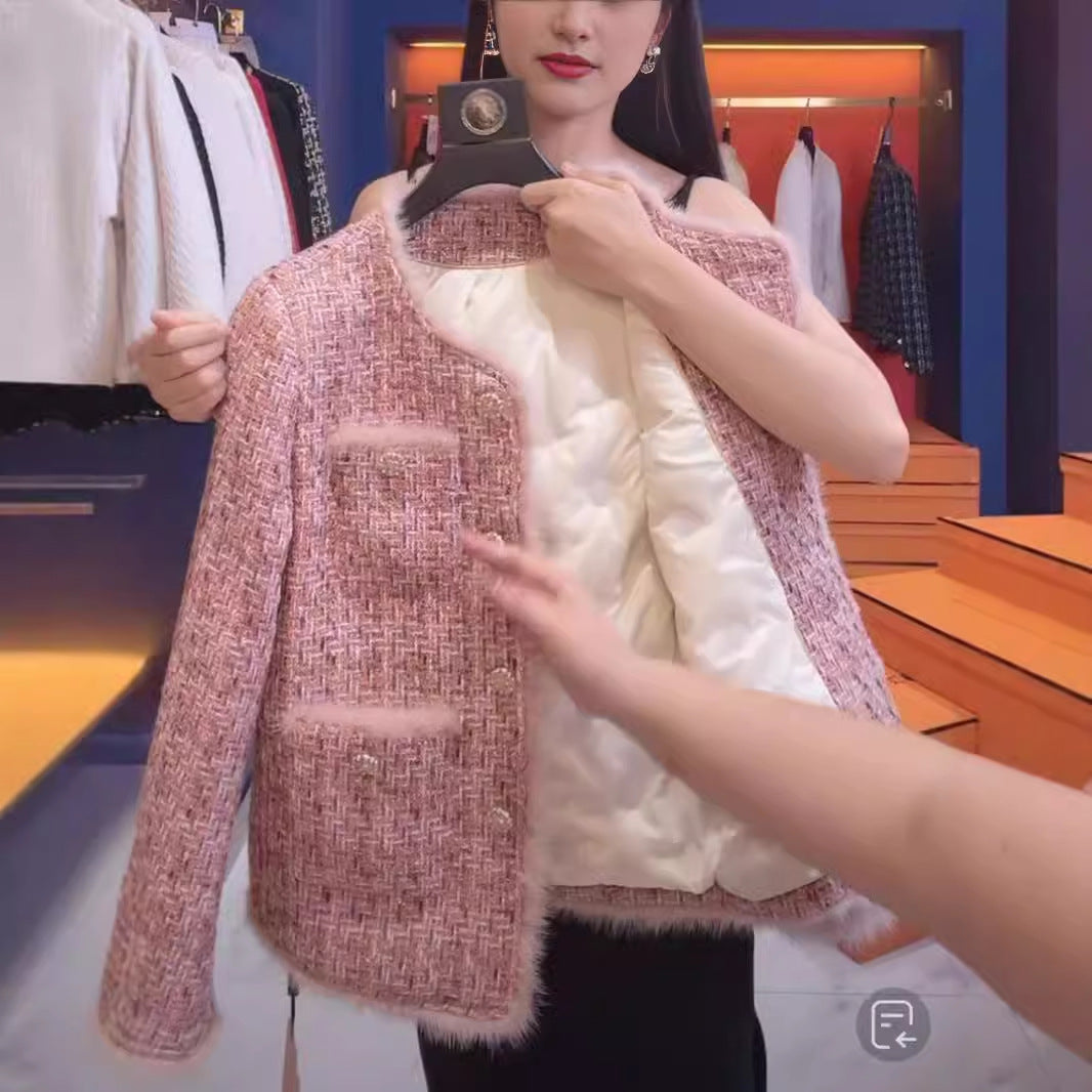 The socialite-style design features elegant detailing inspired by classic Chanel aesthetics, making it perfect for both casual outings and upscale events. Its thickened construction provides excellent insulation without sacrificing style, while the soft pink color adds a feminine and trendy touch to your winter wardrobe.