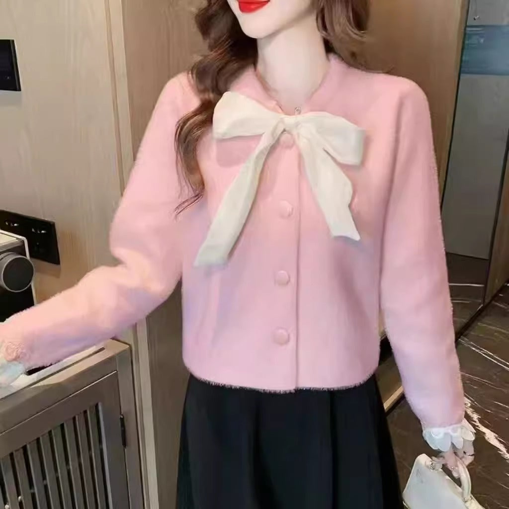 Featuring a stylish tweed-like texture, delicate bow details, and a refined silhouette, it’s the perfect outerwear piece for layering over dresses or pairing with jeans for a chic, put-together look 👗🎀. The soft knitted fabric keeps you warm and comfy, while the structured design adds sophistication to your everyday outfits.
