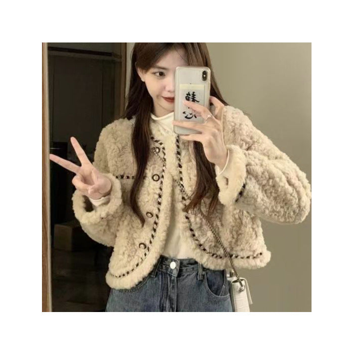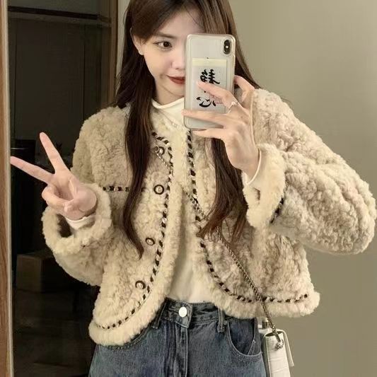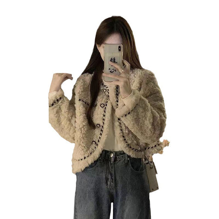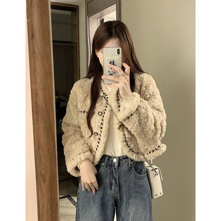 Made from premium imitation lamb wool with cotton lining, it provides softness, warmth, and a lightweight feel. The loose short style offers freedom of movement and effortless layering, while the tweed texture adds sophistication and street-chic appeal. Ideal for pairing with jeans, skirts, or trousers, this jacket is a versatile addition to any wardrobe.