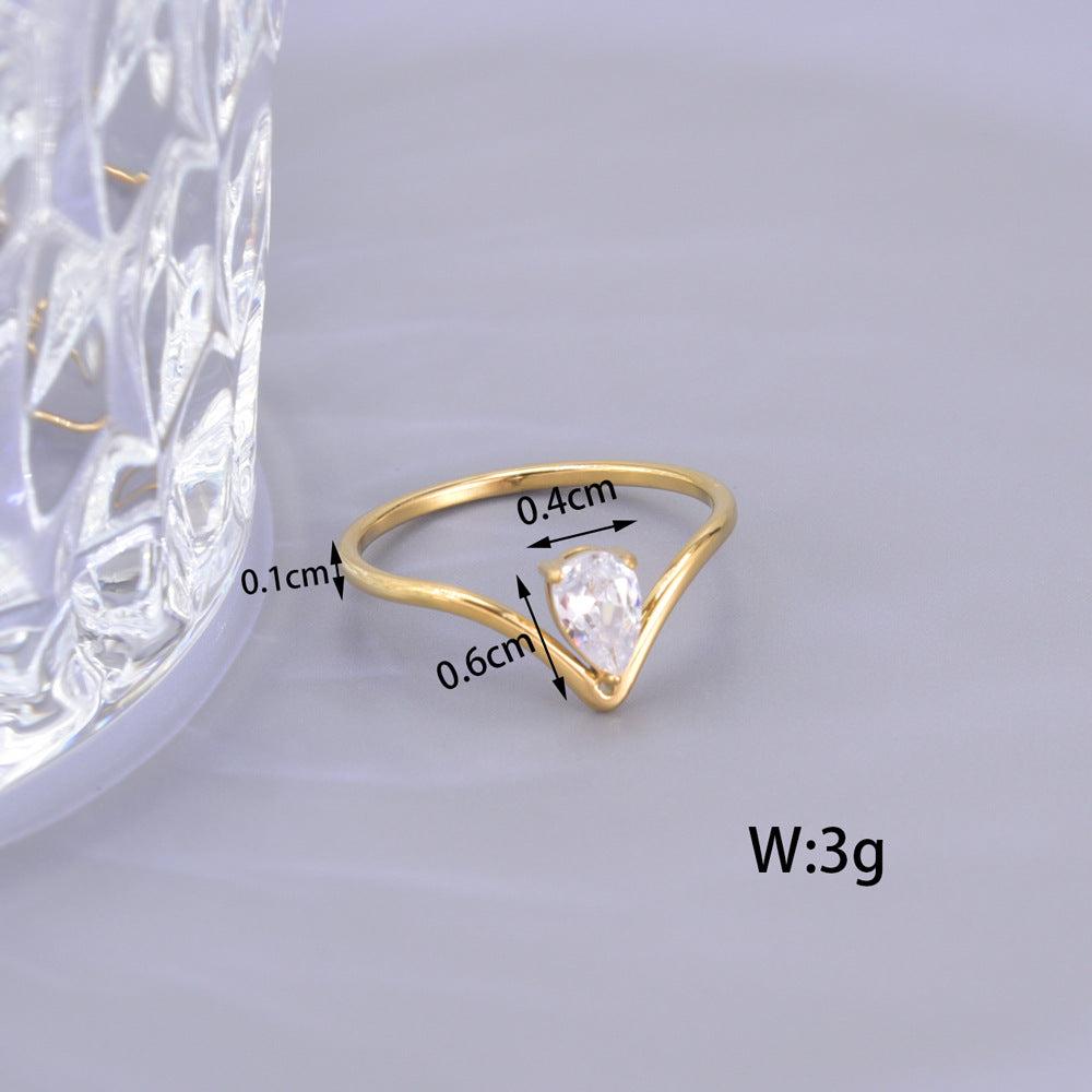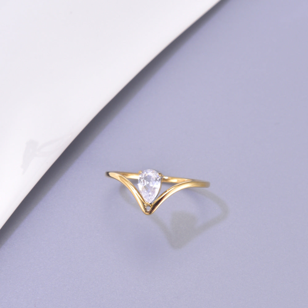 V-Shaped Water Drop Zircon Ring – 18K Gold Plated