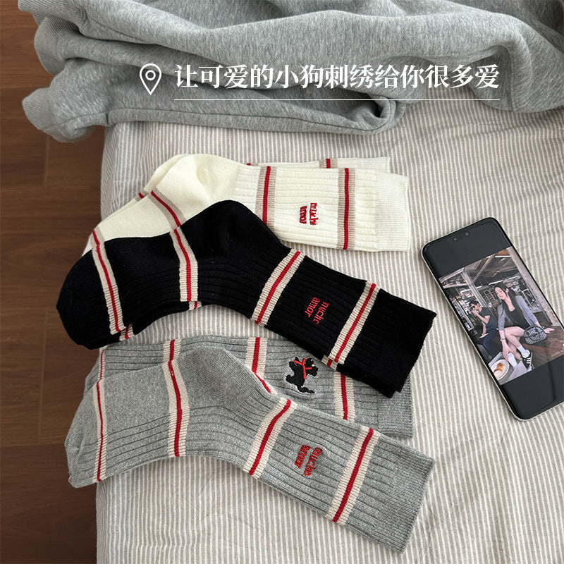 🐶 Stay cute and cozy with these Puppy Embroidered Socks! Perfect for autumn and winter, these cotton mid-length socks are trendy, soft, and totally adorable – the pawsitive choice for everyday outfits.