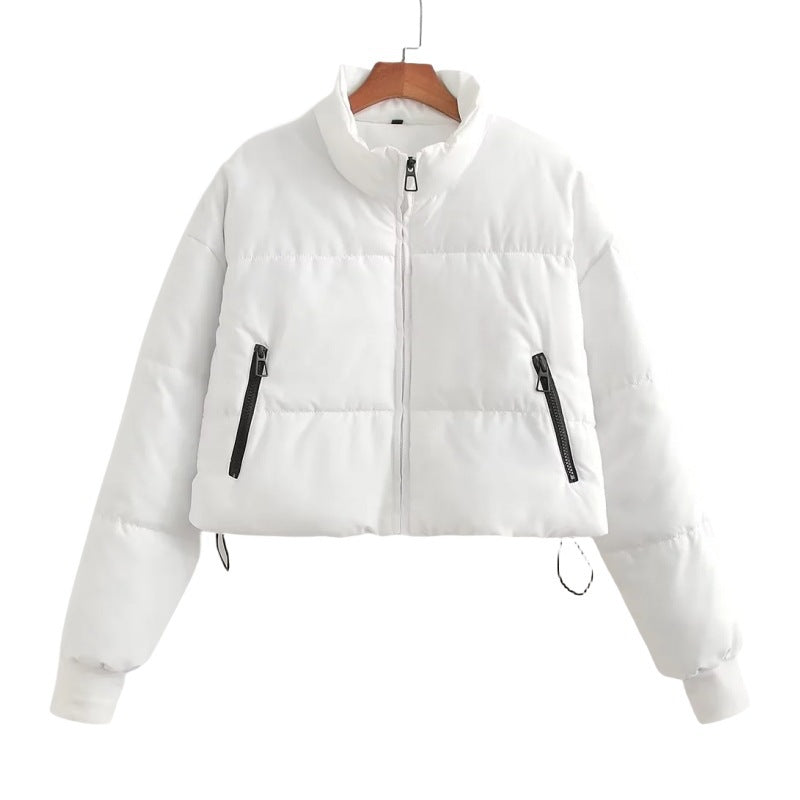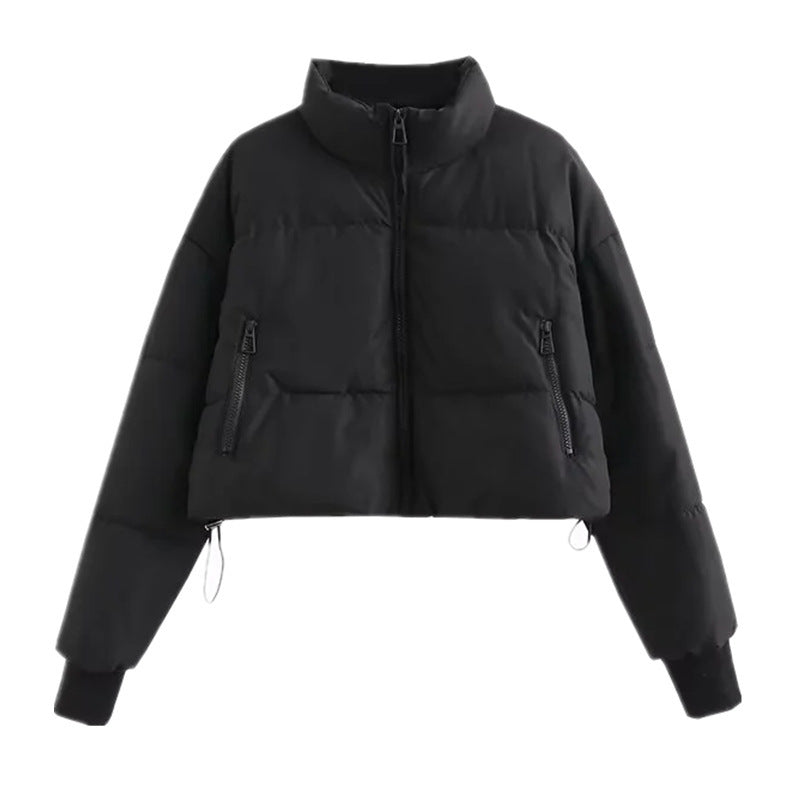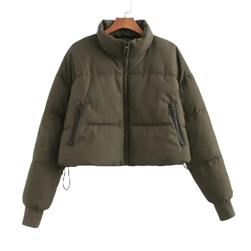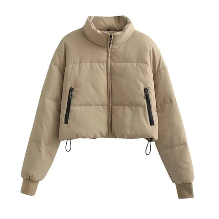 Khaki Stand Collar Drawstring Cotton Jacket Women