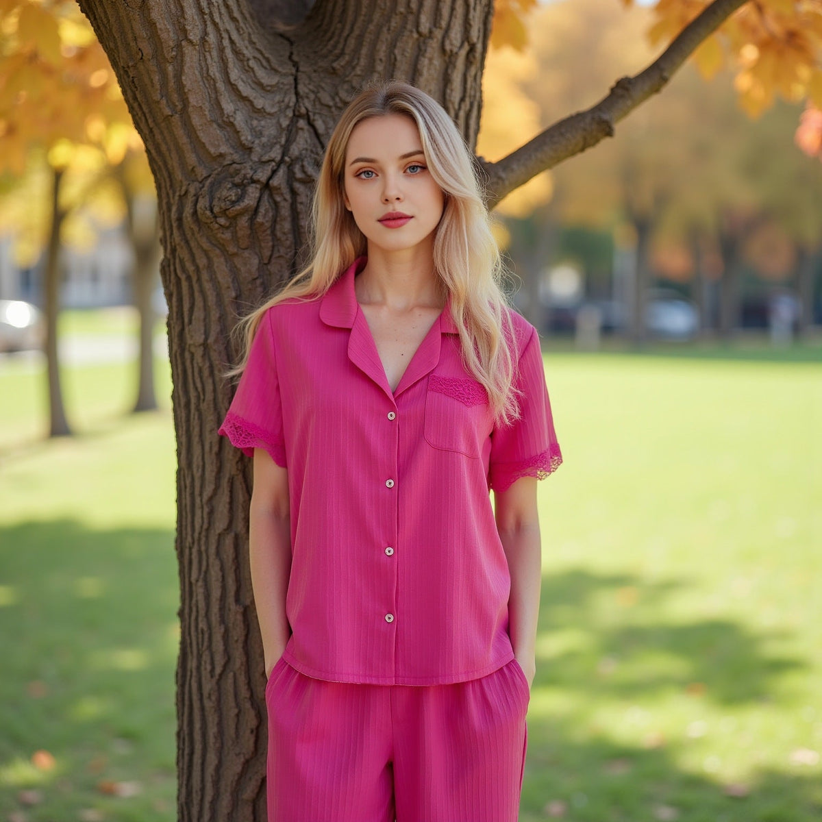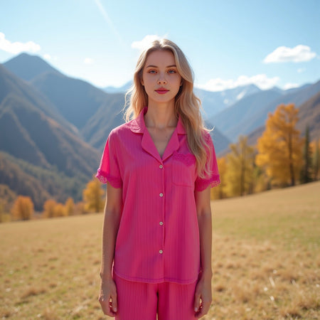 Add a touch of elegance to your loungewear with our Womenโs Woven Fashion Pajama Set! ๐ธ Featuring a wave stripe stitching design and delicate lace accents, this short sleeve pajama set combines comfort with a chic, fashionable style. The breathable fabric is perfect for lounging at home, while the stylish details make it easy to relax in luxury. Whether youโre enjoying a quiet evening or catching up on your favorite shows, this set offers both comfort and elegance for your homewear needs. ๐