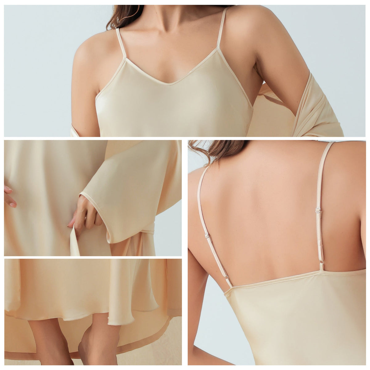 🌙 Crafted from soft, silky satin, it feels smooth against the skin while giving a fashionable and elegant look. The spaghetti strap dress offers a lightweight, breathable fit, while the matching long robe with belt tie adds a touch of sophistication and coverage.