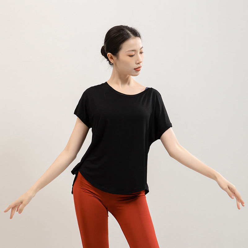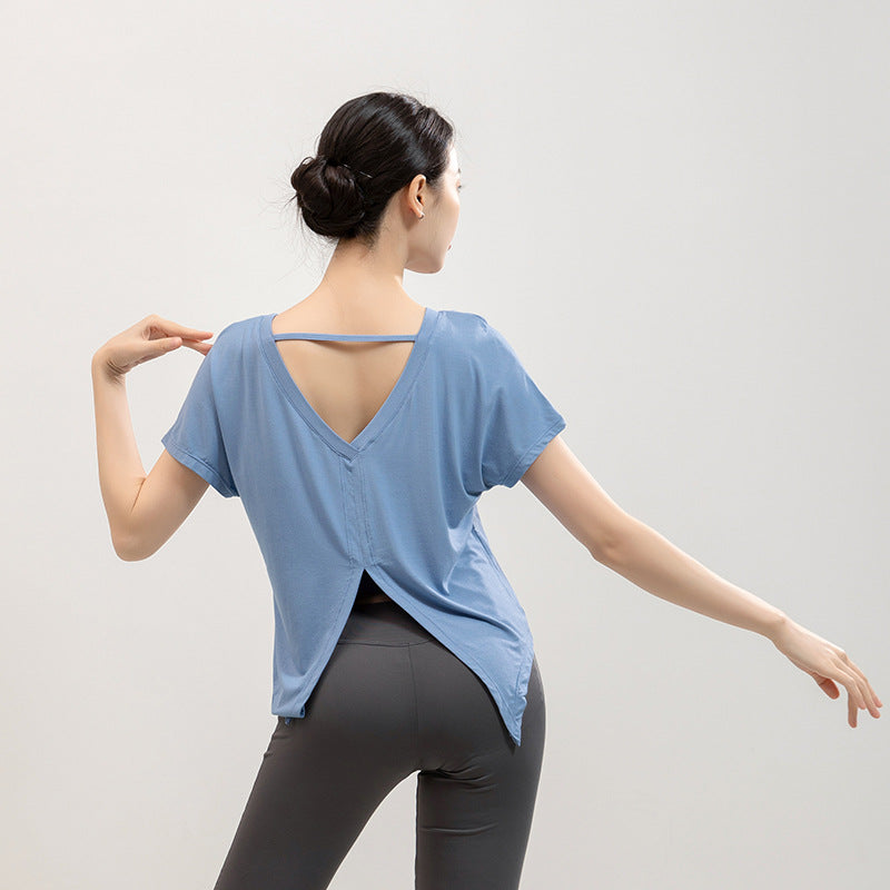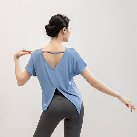Made from lightweight, breathable fabric, this T-shirt ensures excellent moisture-wicking to keep you dry during intense exercise. The unique Xia Mei back split design adds a fashionable touch while providing enhanced airflow for comfort. Its loose fit allows full freedom of movement, making it ideal for yoga, running, dance, or gym workouts. Pair it with leggings or shorts for a chic and functional activewear outfit. 🌟