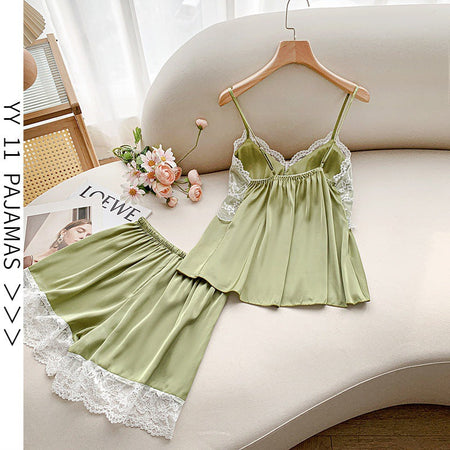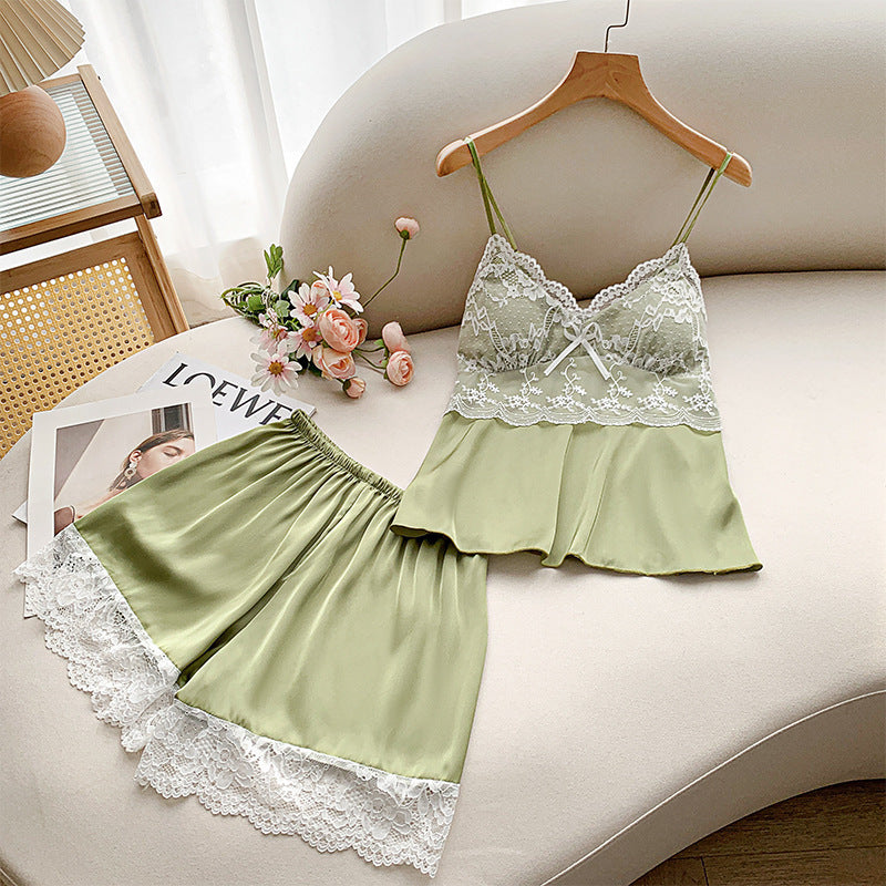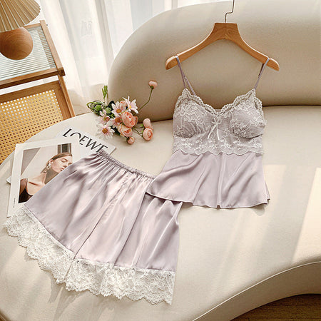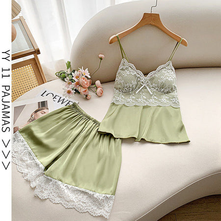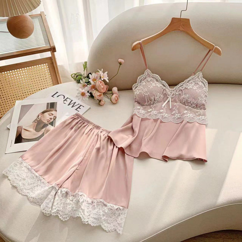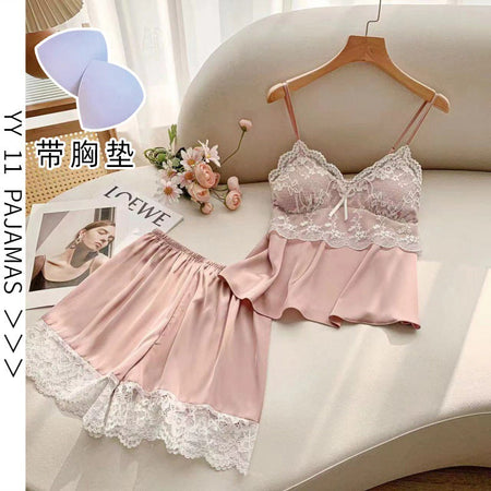 Ice Silk Lace Shorts Pajama Set with Chest Pad
